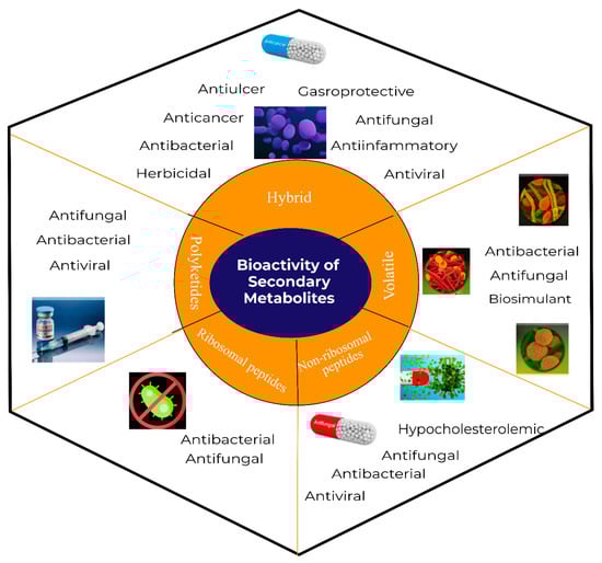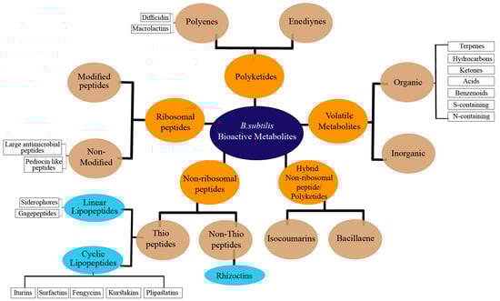 The impressive skill set of B. subtilis for producing diverse bioactive metabolites was recognized in the last decade. It has been demonstrated that ~5% of a wild-type B. subtilis genome is exclusively devoted to the synthesis of bioactive compounds []. For a long time, it was considered for the production only of cyclic peptides such as iturins, surfactins, and fengycins [,]. Nonetheless, due to the discovery of numerous antimicrobial exhibiting linear lipopeptides, PKs, and volatile metabolites, it has gained a high commercial interest. The versatile bioactive metabolites produced by the B. subtilis group may be classified based on several criteria, including their biosynthetic pathways, function, structure, source, physicochemical properties, molecular targets, or bonding patterns []. Herein, we classified the bioactive metabolites from B. subtilis based on their molecular structures and biosynthetic pathways (Figure 1). In the current review, the bioactive metabolites produced by B. subtilis are classified into five classes, including non-ribosomal peptides (NRPs), polyketides (PKs), ribosomal peptides (RPs), and hybrid and volatile metabolites. These five classes are further categorized into various subclasses and described in detail.