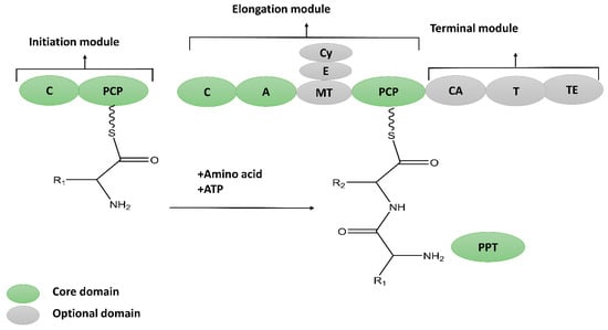 NRPs are molecular assembly machines that use multi-modular enzyme complexes rather than a DNA template to construct a protein []. A module is a part of the non-ribosomal peptide synthetases (NRPS) enzymes that assimilates the amino acid into a peptide backbone of a specific kind. Further, each module may be divided into three domains, adenylation (A), thiolation (T) or peptidyl carrier protein (PCP), as well as a condensation (C) domain that catalyzes the individual steps of NRP synthesis [] (Figure 2). The synthesis of the primary product might be post-synthetically modified to obtain its mature form via glycosylation, methylation, hydroxylation, acylation, heterocyclic ring formation, and halogenation [,]. NRPs exhibit vast structural diversity and may be found as linear, branched, and cyclic structures. So far (January 2022), the Norine (Non-ribosomal peptide database) contains 1740 peptides, including information about their biosynthesis, structures, and evolution [].