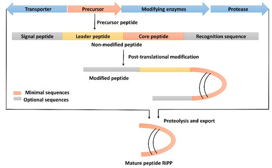 Schematic representation of biosynthesis of ribosomal peptides (RPs). The short precursor peptides are converted into core peptides, and then the core peptide is matured via post-translational modifications.