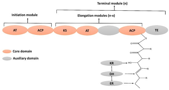 Polyketides are structurally diverse bioactive metabolites that contain an alternative methylene and carbonyl group []. Polyketides are widely used as therapeutic agents to treat numerous diseases []. For instance, tetracycline and erythromycin are used as antibacterials [], amphotericin is used as an antifungal [], and anthracyclin is used as an antitumor drug []. The biosynthesis of PKs is carried out by a multi-domain enzyme, which consists of ketosynthase, acyltransferase, and thioesterase. Its biosynthesis is initiated by loading the acyl CoA on acyl carrier protein (ACP), catalyzed by acyltransferase (AT). The ketosynthase (KS) extends the carbon chain via decarboxylative condensation. The ketoreductase (KR), enoyl reductase (ER), and dehydratase (DH) domain may further modify the beta-keto group to produce diverse PKs (Figure 5). Subsequently, the thioesterase domain terminates the elongation process by cyclizing or hydrolyzing the PK chain from ACP and releasing a mature PK peptide [].
