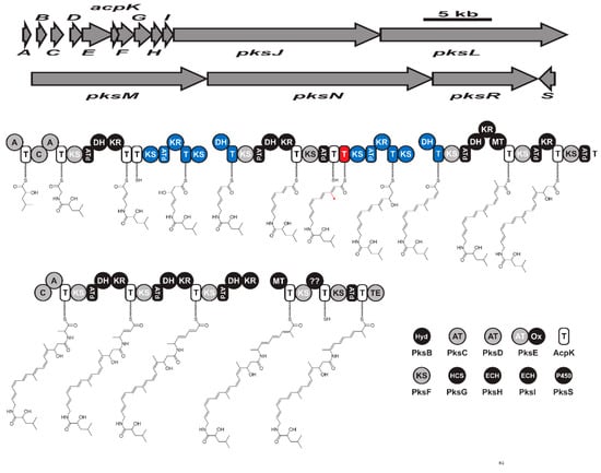 Besides that, four antibacterial metabolites have recently been isolated from marine B. subtilis that exhibit antagonistic activity against G-negative food pathogens []. Their biosynthetic pathway was speculated to be synthesized via the PKS. Their cytotoxicity, antifungal activity, and complete structure are still unclear.