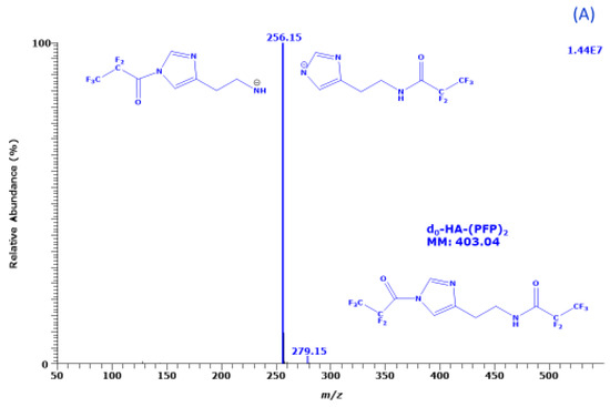 EA extracts of derivatized mixtures of amines were analyzed by GC-MS. The retention time (and the coefficient of variation CV, %) of the PUT derivative was 7.942 min (0.05%). The retention time of the AGM derivative was 9.26 min (0.00%). The retention times of the PFP derivatives of d0-HA and d4-HA were 10.93 min (0.08%) and 10.90 min (0.07%), respectively. The retention times of the PFP derivatives of 13C0-SPD and 13C4-SPD were 11.42 min (0.04%) and 11.42 min (0.00%), respectively.