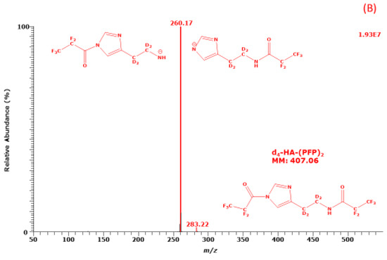 The most intense ions in the GC-MS mass spectra of the PFP derivatives of d0-HA and d4-HA are m/z 256 and m/z 260, respectively. Much less intense ions in these mass spectra are m/z 279 and m/z 283, respectively. The difference of 4 Da in these two ion pairs and the shorter retention time of the d4-HA derivative compared to the d0-HA derivative are due to the presence of four deuterium atoms in the d4-HA derivative. The occurrence of m/z 279 and m/z 283 in the GC-MS spectra suggests the derivatives each contain two PFP residues. Under the derivatization conditions (30 min, 65 °C) d0-HA and d4-HA react with PFPA form di-PFP derivatives, i.e., d0-HA-(PFP)2 and d4-HA-(PFP)2, respectively. The mass fragments, m/z 279 and m/z 283, are likely to result from the loss of a PFP residue (CF3CF2CO, 147 Da) from d0-HA-(PFP)2 (molecular mass, 403) and d4-HA-(PFP)2 (molecular mass, 407), respectively. The missing consecutive neutral losses of HF (20 Da) from m/z 279 and m/z 283 in the mass spectra to generate ions with m/z 259 and m/z 263, respectively, suggest the PFP residue (147 Da) of the imidazole ring of HA is lost during NICI [9] (Figure 1).