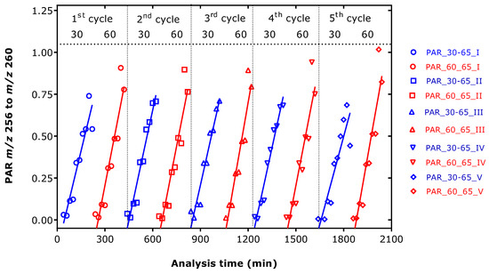 Peak area ratio (PAR) of m/z 256 for d0-HA to m/z 260 for d4-HA from duplicate GC-MS analyses in the SIM mode of standard mixtures of d0-HA (0, 70, 280, 420, 700 pmol) and d4-HA (900 pmol) derivatized with PFPA at 65 °C (65) for 30 min (30) or 60 min (60). The derivatives were extracted with EA, and the samples were placed on the autosampler (about 19 °C) and analyzed in five cycles (I, II, III, IV, V). Each sample required about 20 min of analysis, and the total analysis time was about 88 h. The GC program, OTP40, was used. Lines were observed by linear regression analysis. The r2 values were: 0.8976 and 0.8938; 0.9527 and 0.8902; 0.9479 and 0.9093; 0.961 and 0.879; 0.8287 and 0.8821, respectively.