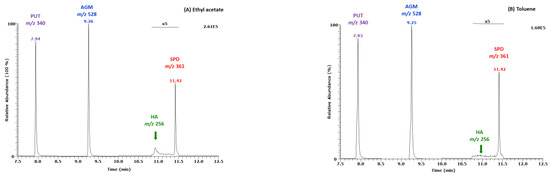 Typical GC-MS chromatograms from analyses of the PFP derivatives in EA and TOL extracts using OTP40 are shown in Figure 3. The PFP derivatives of PUT, AGM, SPD, and 13C4-SPD had almost identical retention times in EA and TOL extracts. The PFP derivatives of d0-HA and d4-HA were found in larger abundance in the EA extracts. On a molar basis, the PFP derivatives of PUT and AGM had similar peak areas in both extracts. The PFP derivatives of SPD and 13C4-SPD had similar peak areas in both extracts as well, but they were considerably smaller compared to those of PUT and AGM. The peak areas of the PFP derivatives of d0-HA and d4-HA were small in EA and not present in TOL extracts (Figure 3). The main results are reported in Table 1 for the individual amines and include retention time (tR) and peak area (PA) of the derivatives, linearity between PA (y) and amine amount (x), and signal-to-noise (S/N) values. Table 1 also reports the peak area ratio (PAR) of the PFP derivatives of 13C0-SPD-(PFP)3 and 13C4-SPD-(PFP)3. The detailed results of this experiment for PUT, AGM, and SPD are presented in the Supplementary Material (Table S1) to this work.