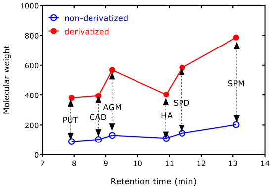 Spermine (SPM, C10H26N4) is considerably longer than SPD (C7H19N3) and forms a tetra-PFP derivative (SPM-(PFP)4) upon derivatization with PFPA under the same derivatization conditions. GC-MS analysis of derivatized SPM showed decomposition, yet not to PUT and SPD [9]. Increasing length of the polyamine PFP derivatives seems to be associated with increasing thermal instability analogous to the methyl ester PFP derivatives of di- and tripeptides, such as glutathione and ophthalmic acid [20,21]. The retention time of the PFP derivatives of the investigated amines is proportional to the molecular weight of the native and derivatized amines (Figure 4), but it is independent of the molar ratio of derivatized to non-derivatized amines (4.01 ± 0.28; CV, 7%). Figure 4 shows AGM and HA behave differently than the other amines, presumably due their guanidine and imidazole groups, respectively. It seems the PFP residue of the guanidine group of AGM increases the volatility of AGM-(PFP)3 stronger than the PFP residue of the imidazole group of HA-(PFP)2. Other polyamines, such as cadaverine and spermine (Figure 4), and other biogenic amines, such as tryptamine and beta-phenylethylamine (not tested in the present study), are likely not to interfere with the analysis of PUT, AGM, HA, and SPD as their PFP derivatives. They are expected to form PFP derivatives with distinctly different mass spectra and retention times under the same derivatization and GC-MS conditions.