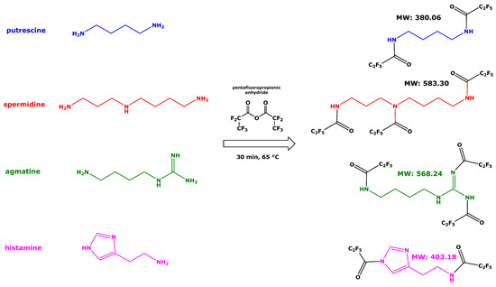 Chemical structures of putrescine, spermidine, and agmatine [9] and proposed chemical structure of histamine (in this work) in their native forms and as their N-pentafluoropropionyl (PFP) derivatives obtained using pentafluoropropionic anhydride in ethyl acetate. The molecular weight (MW) is reported for the PFP derivatives only.