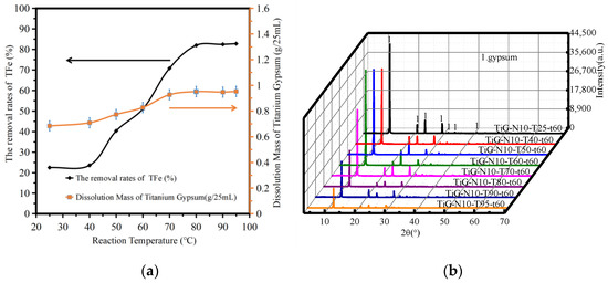 The influence of reaction temperature. (a) The dissolution amount of TiG and the removal rate of total iron. (b) The XRD patterns of the acid leaching products.