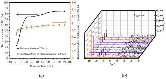 Figure 4a shows the variation in the amount of titanium gypsum dissolution and the iron removal rate with differing ratios of liquid to solid. The analysis shows that the dissolution amount of titanium gypsum increased slightly with increasing liquid–solid ratio. When the liquid–solid ratio exceeded 8, the dissolution amount of titanium gypsum did not change significantly. When the liquid–solid ratio was 6–14, the removal rate of TFe increased from 74.32% to 83.98%. When the liquid–solid ratio increased to 8, the removal rate of TFe increased to 81.98%, and the removal rate of TFe remained unchanged. As ferric citrate, formed by the acid–base neutralization reaction, entered the solution, the removal rate of iron increased, but the content of iron compounds in the system was constant. Therefore, when the liquid–solid ratio continued to increase to a certain critical point, the total iron removal rate in titanium gypsum did not change significantly.