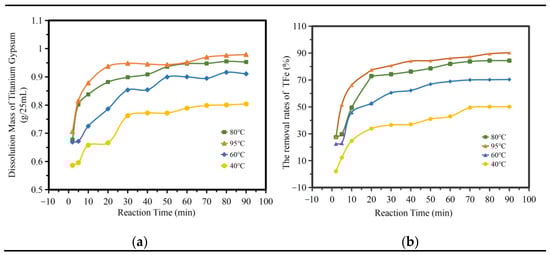 Figure 7a shows the influence of different temperatures and times on the amount of titanium gypsum dissolution. As can be seen from the figure, the amount of titanium gypsum dissolution increased significantly at 2–20 min. At 95 °C, the amount of titanium gypsum dissolution reached a maximum of 0.9372 g/25 mL; while at 20–90 min, the amount of dissolution increased gently; at 40 °C, the maximum increase amount was 0.1379 g/25 mL. The dissolution of impurities in titanium gypsum can be divided into two stages. Figure 7b shows the influence of the TFe removal rate at different temperatures and times. As can be seen from the figure, iron removal was concentrated mainly in the first 20 min. At 95 °C, the TFe removal rate reached its highest at 77.51%, while the TFe removal rate increased gently from 20 to 90 min, and the maximum increase in the TFe removal rate was less than 20%. This kinetic curve was consistent with the kinetic characteristics of the reaction in the multiphase liquid–solid region [22,23], that is, the first stage is the accelerated reaction stage, and the second stage is the gentle completion stage.