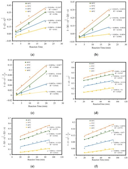 According to the shrinkage unreacted core model and the different reaction conditions, the chemical kinetics of the leaching of iron compounds in a ferric citrate solution can be divided into chemical reaction control, diffusion control, and product layer diffusion control. It is speculated that the leaching reaction process of iron compounds is composed of the chemical reaction steps at the liquid–solid interface and a diffusion step of the hydrated citrate product generated through the reaction coating on the unreacted layer. The whole reaction process can be controlled by the chemical reaction steps or the diffusion step of the reaction product layer, or other steps. The experimental results of 2–20 min and 20–90 min were adjusted by chemical reaction control, reaction product layer control, and internal diffusion control, respectively, as shown in Figure 8a–f. As can be seen from the figure, iron leaching results fitted better with the reaction product layer control and internal diffusion control.