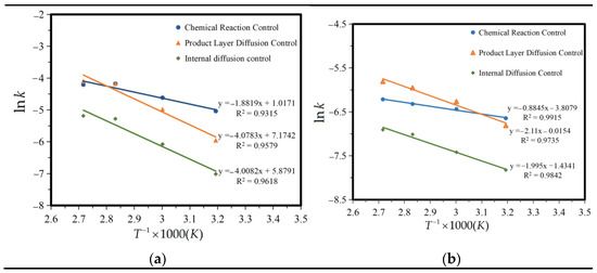 Fitting of ln k and 1/T. (a) 2–20 min, and (b) 20–90 min.