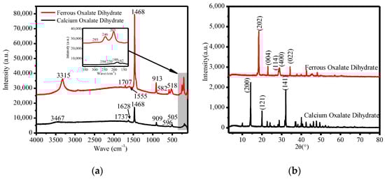 Figure 10a shows the Raman spectra of calcium oxalate and ferrous oxalate produced under experimental conditions. It can be seen from the figure that the wave number is 100 cm−1–300 cm−1, and there are strong Raman vibration peaks between. The peak values of calcium oxalate are 259 cm−1, 220 cm−1, 188 cm−1 and 162 cm−1, which can be derived from the stretching and bending vibrations of Ca−O. Ferric oxalate peak values are 293 cm−1, 246 cm−1, and 203 cm−1, due to the stretching and bending vibrations of Fe−O. Calcium oxalate has weak peaks at 596 cm−1 (broadened, due to the water vibration mode) and 505 cm−1 (possibly due to the symmetrical O−C=O bending mode), and ferrous oxalate has vibration peaks at 582 cm−1 and 518 cm−1 (possibly due to the symmetrical O−C=O bending mode). Raman frequency peaks near 900 cm−1 are derived from C−C stretching mode, calcium oxalate at 909 cm−1 and ferrous oxalate at 913 cm−1. There is a vibration stretching mode V (C−O) in the wave number range 1456 cm−1 to 1473 cm−1. Both calcium oxalate dihydrate and ferrous oxalate have a vibration peak at 1468 cm−1, and a vibration peak of the symmetrical stretching mode appears near the low wave number. The vibration peak of calcium oxalate dihydrate is 1411 cm−1, and that of ferrous oxalate is 1450 cm−1, which can be derived from the B2g mode (O−C=O vibrations). The vibration peaks of calcium oxalate dihydrate at 1628 cm−1 and 1737 cm−1, and that of ferrous oxalate at 1555 cm−1 and 1707 cm−1, may be caused by the stretching mode of V (C=O). We observed that the OH vibration peaks of the two oxalates were significantly different. The vibration peak of calcium oxalate dihydrate was 3467 cm−1, and the vibration peak of ferrous oxalate was 3315 cm−1.