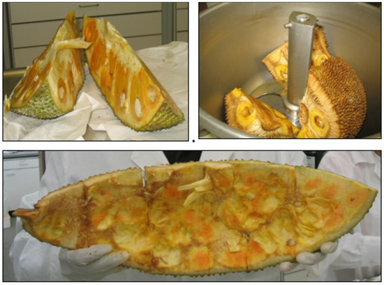 Processing of jackfruit: top left: cutting wedge-shaped section from jackfruit; top right: comminution of the whole fruit; bottom: peel remaining after removal of edible part.