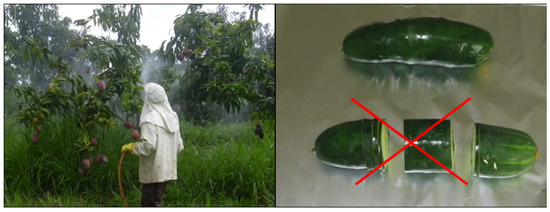 The distribution of residues within the natural crop units is also uneven. For instance, the residues concentrate on the lower part of fruits hanging on the trees or vines due to the runoff of the sprays. Therefore, slices should never be cut from crop units (Figure 3).