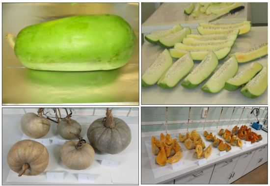 Cutting wedge-shaped portions of large fruits. Top left: papaya fruit; Top right: papaya subsamples; Bottom left: winter squash; Bottom right: sections of winter squash. Note: that the cut portions from each fruit should be kept in separate groups until taking the required number of pieces from each group for comminution.