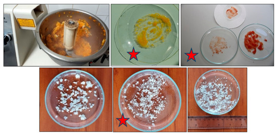Top row left Blending winter squash; top center and right: tomato homogenates on filter paper and Petri dish; second row: cabbage leaves homogenized to different particle sizes. The star marks the acceptable particle size distribution.