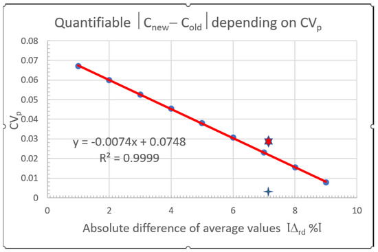 The corresponding Δrd and CVP values are plotted on Figure 6. It can be seen that for the B standard solutions the CVp is above the critical line. Consequently, according to the TOST calculation, we cannot state with 95% probability that the difference between B1 and B2 standard solution is ≤10%.