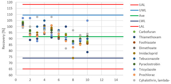 However, the individual quantification of the contributions of the steps affecting CVA can only be done in practice with applying isotope labelled compounds in specialized laboratory conditions with specific detection instruments [74]. Therefore, their combined effect should be determined in practice with repeated recovery tests (CVA) performed at the concentration range that is expected to occur in the samples. Such tests reflect only the effect of operations carried out after spiking the test portions. If the tests are carried out on different days by different analysts the calculated relative standard deviation of the results will only indicate an interim reproducibility of the analyses step, but it is not equivalent to CVL as defined by Equation (2). The results of recovery tests can be used to characterize the within-laboratory reproducibility (CVL) only if they are performed with samples containing incurred residues derived from the prior application of a pesticide [65,72,74].
