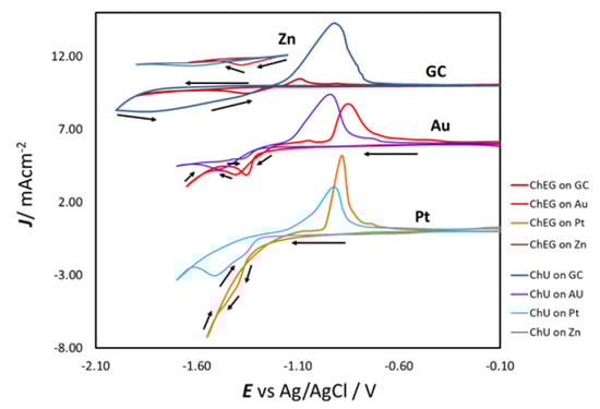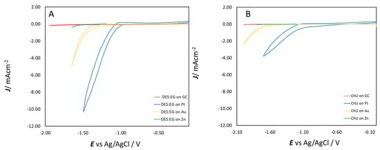 Cyclic voltammograms in the cathodic range for ChEG (Panel (A)) and ChU (Panel (B)) with GC, Pt, Au and Zn electrodes.
