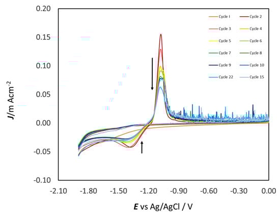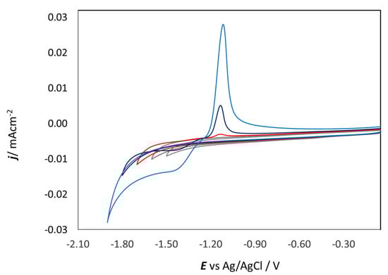 Multiple CVs at a GC WE (Figure 5) progressively develop electrochemical noise in the anodic region, which can be attributed to the rupture of ZnO film produced in the anodic process. A similar dynamic process was observed in an alkaline aqueous solution [37]. In correspondence, the peak CD decreases with the number of cycles (from red to blue), and the cathodic peak is present in the reverse scans of all cycles.