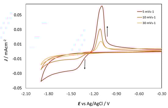 When ZnSO4 is dissolved in DESs, the [ZnCl4]2− species is formed and stabilized by choline [18,19]. Although tetrachlorozincate is the dominant species, it does not seem to be the complex from which Zn is deposited; indeed, [ZnCl4]2− has a very negative reduction potential. Vieira et al. [20,21] suggested the formation of an intermediate electroactive species triggered by the cathodic reaction of the electrolyte. Figure 3 shows CVs in which the cathodic limit was gradually increased from −1.5 to −1.9 V, and one can notice that the CD at the anodic peak increases with the lower vertex potential. At the same time, the reduction peak at −1.5 V is only visible at lower scan rates, which is anticorrelated with the CD (Figure 4). In any case, in Figure 3 and Figure 4, no reduction peak could be detected in the investigated ranges of cathodic vertex potential and scan rate. From these results, it can be inferred that the formation of the electroactive intermediate resulting from the replacement of one or more chloride ligands in [ZnCl4]2− with a cathodic reduction product of EG and/or Ch should be a reaction with slow kinetics. Chronoamperometric measurements on GC, which will be discussed in Section 2.3.1, showed that Zn deposition is already present at −1.35 V. Therefore, the formation of the electroactive intermediate also seems to show a notable time dependence.
