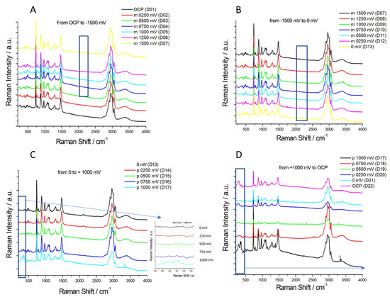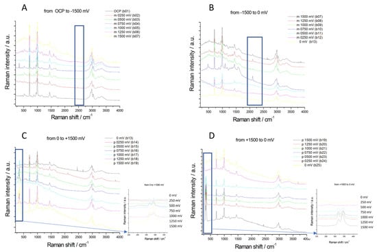 Potential-dependent in situ SERS spectra were measured at an Au electrode in contact with the DESU electrolyte. Panels (A–D) report the spectra recorded in the whole measured range. Blue rectangles highlight diagnostic spectral ranges.