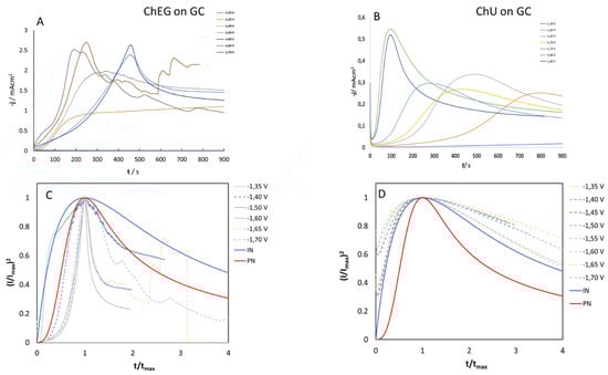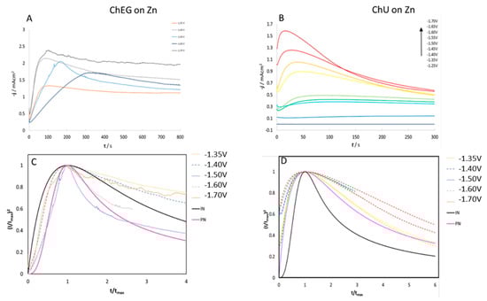 (A,B): Chronoamperograms for 0.3 M ZnSO4 in ChEG (A) and ChU (B) using a GC electrode at 25 °C. (C,D): Normalized experimental curves of Panels (A,B), plotted together with theoretical curves for progressive (solid pink line) and instantaneous nucleation (solid black line) according to the model of [32,33].