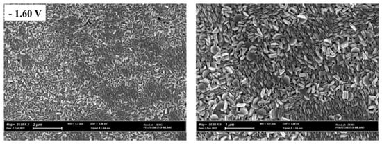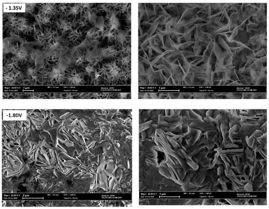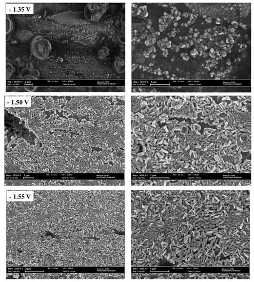 The morphology of Zn layers grown onto polycrystalline Zn from the two electrolytes considered at different potentials has been characterized by SEM. The images recorded show that the zinc layer deposited from ChU (Figure 10) is formed by hexagonal crystallites. The main impact of the four potentials considered is the surface coverage with Zn crystallites. SEM observations also confirm the nucleation mechanism. Indeed, in the IN cases recognized in Section 3.3.1, since all the nuclei are of the same age and grow at the same rate, crystallites of the same dimensions were found (Figure 10). The morphology of the Zn films deposited from ChEG (Figure 11) at the low cathodic overvoltage of −1.35 V exhibits well-defined individual crystallites of the desert rose type, coherent with an IN mechanism. Instead, at higher cathodic potentials, a compact Zn layer forms, consistent with the PN model.