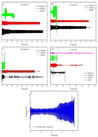 In the borderline AChU case (blue plots in Figure 12), a higher internal resistance prevents the cells from cycling unless low currents are applied; at 0.1 mA cm−2, a gradual overpotential growth is observed, leading to the attainment of the cut-off voltage after 9 ± 2 days. Instead, at 0.2, 0.5 and 1 mA cm−2, the cells reach 2 V right at the beginning of the experiment, denoting high internal resistance. These measurements demonstrate the effect of water within the DES. Indeed, according to [50], the controlled addition of water inside the DES tunes the conductivity of the electrolyte. Comparing Figure 12A,E, it is clear how the conductivity, and thus the ohmic resistance of the electrolyte, plays a fundamental role in cell operation.