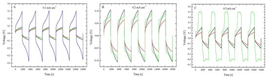 If, on the other hand, the anodic–cathodic switching regime is taken into account (Figure 13), it is clearly visible that DES systems have very similar and stable shapes of the potential transients. In particular, a good symmetry of the shape of the anodic and cathodic transients is noted for U-systems. This behavior suggests good reversibility of the plating/stripping processes, also visible at 1 mA cm−2 for ChU0.3. For ChEG, the chronopotentiometric transients remain regular and symmetric only at low CDs and for a limited period of time; the starting 54 ± 47 cycles at 0.1 and 0.2 mA cm−2 are represented in Figure 13 in green. Instead, at 0.5 mA cm−2, the shapes of the cathodic and anodic branches of the transients are no longer symmetric, suggesting that—at high CDs—EG gives rise to a less stable behavior than U. The same observations also hold for the tests carried out at 1 mA cm−2, with the difference that after the first short circuit, the cells resume a regular cycling behavior but with a different transient shape, changing from a simplified arc-shape to a double-peak one. Comparing ChU0.3 instead with AChU, the second exhibits a similar transient shape but with faster growth due to the presence of more pronounced mass transport effects.