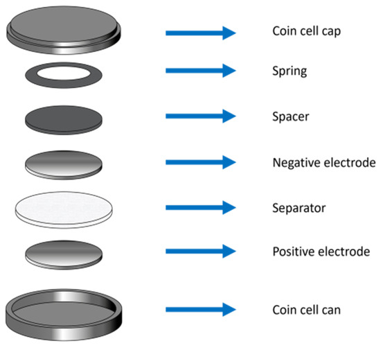 Cycling tests were carried out in symmetric CR2032 coin cells. The electrodes were Zn disks 12 mm in diameter, punched from 250 µm thick foil. The separator consisted of glass microfiber disks 19 mm in diameter and 260 µm thick. An amount of 350 μL of electrolyte, prepared as described in Section 3.1, was added to the cell. The layout of the CR2032 cells is shown in Figure 15.