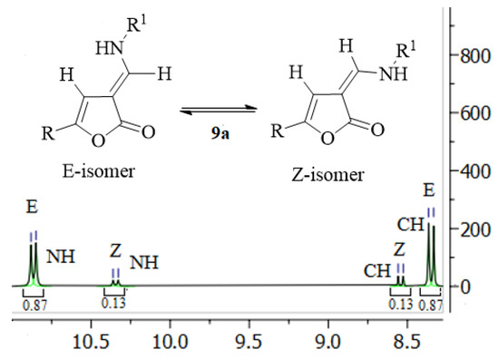 In the FTIR spectrum of compound 9a, recorded in a KBr matrix, the bands attributed to the stretching vibrations of the amino group are observed in the region of 3265–3223 cm−1. The absorption band of the stretching mode of the lactone carbonyl appears at 1725 cm−1, and the stretching vibrations of the conjugated exocyclic C=C double bond appear at 1638 cm−1. This confirms the existence of compounds 9a–f in the aminomethylidene form. An additional confirmation of the existence of 9a in the aminomethylidene form comes from the NMR spectroscopy data. Two sets of signals in the 1H NMR spectra of compounds 9a–c allow us to interpret them as the existence of an equilibrium of E- and Z-forms in solution, the appearance of which is due to the push–pull nature of enamines, in which the furan-2(3H)-one moiety acts as an acceptor group [28,29]. The duplication of the signals in the 1H NMR spectra recorded in DMSO-d6 is observed for signals of exocyclic protons, singlets of vinyl protons at C-4 of the furan-2(3H)-one fragment, and doublets of NH protons for the E- and Z-isomers (Figure 2).