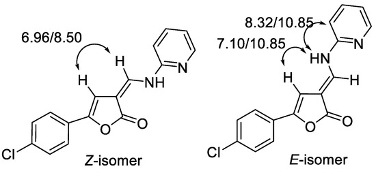 Key NOE-contacts for Z- and E-5-(4-chlorophenyl)-3-(pyridin-2-ylamino)methylidenefuran-2(3H)-one 9a.