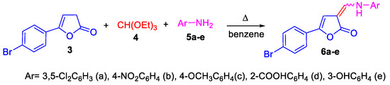 Previously, we have examined the possibility of synthesizing arylaminomethylidene derivatives of furan-2(3H)-ones by a three-component reaction. The reaction proceeds in a one-pot mode and includes aryl-substituted furan-2(3H)-ones 3, an ortho ester 4 as an electrophilic agent, and aromatic amines 5a–e bearing electron-withdrawing substituents [28,29] (Scheme 1).