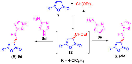 The optimized conditions, scope, and versatility of this protocol allowed us to investigate transformations with various five-membered heterocyclic amines 8c–f. We chose heterocyclic amines with a reduced donor load. Efforts to carry out transformations under one-pot reaction conditions in the case of aminotriazole and aminothiazole failed, which can be explained by the impossibility of the formation of intermediate 10 by way of pathway A (Scheme 3). Thus, we propose an alternative route for the reaction with sequential mixing of the initial components 7 and 4, which allows us to direct the process through the initial in situ formation of the ethoxymethylene derivative of furan-2(3H)-one 12, which then reacts with an amine reagent, added in portions. The transformation involving 2-aminothiazole 8e proceeded similarly (Scheme 4).