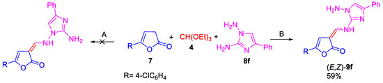 When running the reaction under conditions similar to those described above, we found that the aminomethylidene derivative furan-2(3H)-one 9f was formed with the participation of the amino group without affecting the “hydrazine” amino group, which was established from the spectral data. We believe that this serves as another example of the newly discovered inverse α-effect [33]. It was shown that 9f existed in a DMSO-d6 solution as a mixture of E- and Z-isomers in a ratio close to 1:1, which can be explained by the high donor properties of the “non-hydrazine” amino group and by the absence of intramolecular interactions, in contrast to 9d,e.