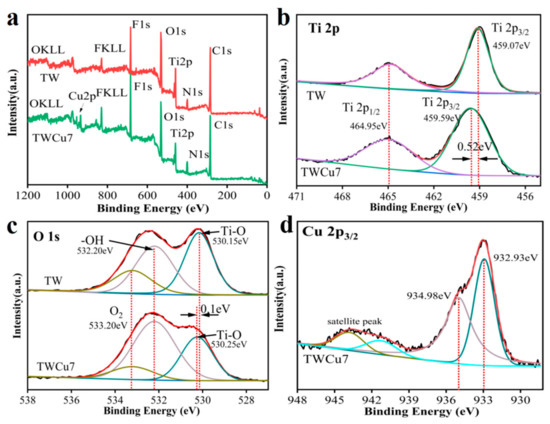 X-ray photoelectron spectroscopy (XPS) was employed to investigate the surface chemical composition of the sample. As shown in Figure 3a, C, O, N, F, and Ti were detected in TW, while C, O, N, F, Ti, and Cu were detected in TWCu7, indicating that TWCu7 was successfully doped with Cu. The presence of C could be attributed to the wood substrate or other carbon-based impurities, while the N and F could come from the (NH4)2TiF6 precursor. Figure 3b presents the high-resolution XPS spectra of Ti 2p of the TW and TWCu7 samples. The Ti 2p core-level spectrum of TW displayed two peaks at 464.95 eV and 459.07 eV, corresponding to Ti 2p1/2 and Ti 2p3/2, respectively. The binding energy difference between the two peaks of TW was approximately 5.88 eV, indicating the presence of the Ti4+ oxidation state. The Ti 2p1/2 and Ti 2p3/2 peaks of TWCu7 were observed at 464.95 eV and 459.59 eV, respectively. Nevertheless, the energy at Ti 2p3/2 observed in the TW sample was approximately 0.52 eV lower than that of the TWCu7 sample. The change in Eb could be attributed to the contact between the Ti4+ host ions and the doped Cu ions, indicating the formation of a certain interaction between Cu and TiO2, corroborating the literature [35,36]. Figure 3c presents the high-resolution XPS spectra of O 1s in the TW and TWCu7 samples. The peaks at 530.15, 532.20, and 533.20 eV were assigned to Ti–O, the hydroxyl groups on the wood’s surface, and the adsorption of oxygen in water molecules or carbon–oxygen bonds, respectively [37,38,39]. The binding energy of the Ti–O bond in the TWCu7 sample was 0.1 eV higher than that in the TW sample. This change in binding energy indicates that the following electron density of O in the samples had changed after doping with Cu and Ti–O–Cu bonds were formed [40]. Therefore, there was an unusual electron transfer behavior between the Ti4+ and Cu ions, which explained the successful doping of Cu into the TiO2 nanoparticles. Figure 3d indicated the high-resolution spectrum of Cu 2p3/2. The distinctive peak at 932.93 eV was the characteristic peak of Cu 2p3/2 for Cu+. The peak at 934.98 eV was the characteristic peak of Cu 2p3/2 and was assigned to Cu+. In addition, the Cu on the TWCu7 surface displayed a high degree of redox reversibility between Cu2+ and Cu+, which was conducive to the progress of the photocatalytic reaction process [41]. The Cu and the binding energy transition of Ti 2p3/2 were observed by XPS, which confirmed that Cu had been doped successfully into the TiO2 nanoparticles.
