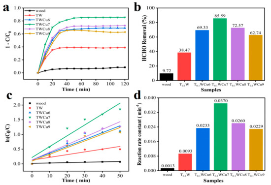 Compared with the pure Cu-TiO2 powder, the Cu-TiO2 nanoparticles anchored on wood exhibited much greater dispersion and a larger active area. In addition, abundant hydroxyl groups on wood can also provide abundant reactive groups for the breakdown of formaldehyde. The porous structure of wood is an excellent channel for moving gas molecules and preventing gas accumulation on the wood, reducing the photocatalytic performance. In this process, it benefited from the synergistic effects of natural wood and the Cu-TiO2 photocatalyst.