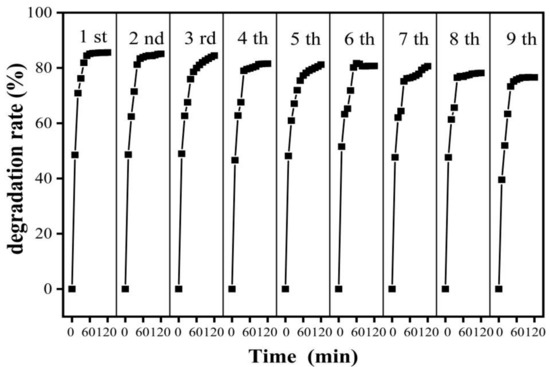 In practical applications, the recyclability of TWCu7 is also important. Therefore, the stability and recyclability of the TWCu7 sample were tested. The photocatalytic performance of the TWCu7 sample decreased with the increasing number of times recycled (Figure 6). The photocatalytic efficiency of the TWCu7 sample was more than 80% after 7 cycles and 76.59% after 9 cycles. The photocatalytic efficiency of the sample did not vary significantly, suggesting that the photocatalyst enhanced with Cu ions on a wood substrate had outstanding photochemical stability. Moreover, it was a promising and effective way to remove formaldehyde from indoor air. The enhanced stability of TWCu7 maybe due to the following two reasons: (1) efficient accelerated separation between photoinduced electron–hole pairs, or (2) during the photodegradation process, the porous structure of wood can offer faster gas diffusion for the product, preventing aggregation of the product and photocatalyst deactivation.