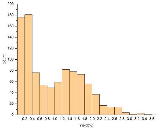 The leaf essential oils of 974 C. camphora individuals from 35 populations in 13 provinces were extracted and analyzed. A distribution interval of 0.2% was used to draw the frequency distribution map (Figure 1). The average essential oil yield of all individuals was 0.95%, and different individuals presented yields in the range of 0.01–3.46%. As shown in Figure 1, 176 individuals had essential oil yields less than 0.2%, and 181 individuals had essential oil yields between 0.2% to 0.4%. Nearly half of the individuals had relatively low essential oil yields (<0.6%), while a few individuals (53) had yields of >2.20%, accounting for 5.44% of the total samples. Additionally, several individuals with particularly high essential oil yields of >3.0%, including HB-ES-10 (3.46%), AH-QM-20 (3.28%), JX-AF-11 (3.24%), and JX-AF-38 (3.03%), were potentially excellent individuals for commercial development.