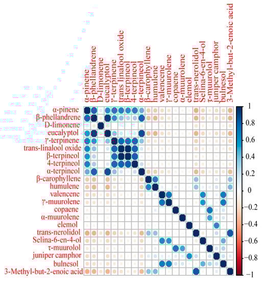 Correlation coefficients indicated significant positive or negative correlations among several sets of compounds (Figure 2). Strongly positive correlations, meaning the compounds were present as a group, were observed among α-pinene, β-phellandrene, eucalyptol, γ-terpinene, trans-linalool oxide, β-terpineol, 4-terpineol, and α-terpineol. β-caryophyllene, humulene, germacrene D, valencene, α-muurolene, germacrene B, selina-6-en-4-ol, and bulnesol formed another positively correlated group. Notably, strongly negative correlations were observed between compounds from the different groups.