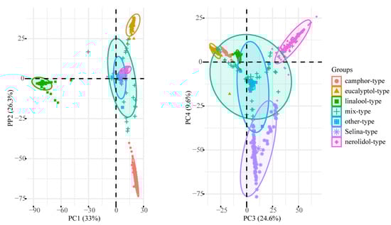 Four principal components (PCs) accounted for 93.69% of the total variance; therefore, these four PCs were used to explain the variance in essential oil (Table 5). A strongly negative correlation was observed between PC1 and linalool levels. PC2 showed strongly positive correlations with β-phellandrene, eucalyptol, and α-terpineol and a negative correlation with camphor. PC3 was strongly and positively correlated with β-caryophyllene, trans-nerolidol, caryophyllene oxide, and 3-methyl-but-2-enoic acid-1,7,7- trimethyl-bicyclo [2.2.1]hept-2-yl ester and negatively correlated with α-pinene, β-phellandrene, eucalyptol, and α-terpineol. PC4 was strongly and positively correlated with valencene, α-muurolene, germacrene B, selina-6-en-4-ol, and bulnesol. As shown in Figure 3, PC1 and PC2 accounted for 33.01% and 26.37% of the total variation, respectively, whereas PC3 and PC4 accounted for 24.72% and 9.59% of the total variation, respectively. PC1 was dominant in samples defined as the linalool type; PC2 and PC3 were dominant in samples defined as the camphor, eucalyptol, and nerolidol types; and PC4 was dominant in samples defined as the selina type. Although the four PCs clearly distinguished these chemotypes, various samples did not clearly fit a specific chemotype.