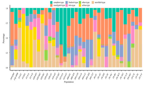 One or two chemotypes were predominant in each population (Figure 4). The eucalyptol and linalool types were predominant in populations from Qimen, Xianning, Changde, Xinhua, Yongzhou, and Hanzhong; the nerolidol type was predominant in populations from Fuzhou, Shaoguan, Zhenjiang, Tonglu, and Yuyao; the selina type was predominant in populations from Huaan, Yongan, and Youxi; and the camphor type was predominant in populations from Gaofeng and Guiyang.