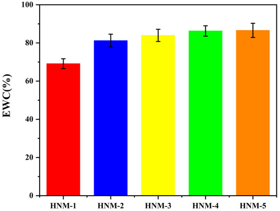 The effect of copolymeric monomers on the EWC of hydrogels is shown in Figure 4. As seen in the figure, as the content of the MCAEM monomer increased, the EWC value of the synthesized hydrogel material then increased until saturation, from 69.15% for HNM-1 to 86.59 % for HNM-5. This is mainly because the MCAEM monomers are hydrophilic monomers, so as the proportion of MCAEM in the synthesized hydrogel increases, the ability of the material to adsorb water molecules inside the material increases, leading to an increase in the EWC value of the material. When the water content inside the material reaches a certain value, the ability to accommodate water molecules in the network structure of the material reaches saturation, so the EWC value of the hydrogel material no longer increases as the proportion of MCAEM in the synthetic hydrogel increases further.