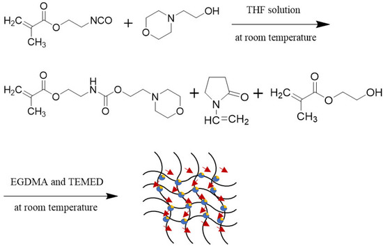 2-hydroxyethyl methacrylate (HEMA), N-vinylpyrrolidone (NVP), ethylene glycol dimethacrylate (EGDMA), potassium persulfate (KPS), N,N,N′,N′-tetramethyl ethylenediamine (TEMED), 2-morpholine ethanol, isocyanoethyl methacrylate, and ethyl acetate were purchased from Shanghai Mac Ltd. All the aqueous solutions were prepared to use laboratory-prepared deionized water (0.055 μΩ). HNM Hydrogels were firstly prepared as a novel adsorbent for adsorption of SO42−, as shown in Scheme 1.