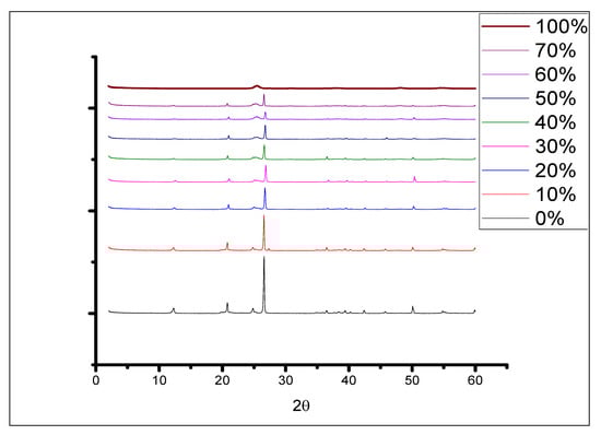 Pure kaolinite has a composition of Al2O3 (39.5%), SiO2 (46.5%), and structural water (14.0%). Above 400 °C, kaolinite loses the structural OH [15]. It is inert and can be used in industry over a pH range between 3 and 9 [17]. The most important commercial varieties are China clay, ball clay, refractory clay, and flint clay [17]. Kaolinite is used in various industries as paper filling and coating, ceramics, and fiberglass, as well as in cement, refractories, plastics, rubber, paint, geopolymers, cosmetics, polymers, and various catalysts and catalyst carriers. Modified raw kaolinite is used to create new support for the immobilization of metalloporphyrins [12,16,17,18]. Quantitative analysis of the TiO2-JK nanocomposites prepared in this study was performed using XRF. The compositions (listed in Table 1) show that the TiO2 percentage is close to the calculated ones after composite preparations.