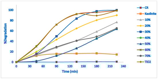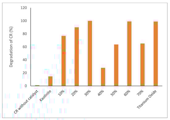Figure 4 shows the photodegradation of CR under sunlight irradiation. The absorption of the CR to calculate the degradation percentage was at 497 nm. According to the blank test (without catalyst), the concentration of CR does not change, indicating that CR is stable under solar irradiation. In addition, the CR concentration in the presence of kaolinite does not change after 30 min, whereas in the presence of TiO2-JK NC, its concentration decreases, indicating that the photocatalytic nanocomposite is successful in the degradation of CR (Figure 4). The ratios of 30 and 60% TiO2 provided the best photocatalytic activity for the degradation of CR under natural sunlight. Heterogeneous photocatalytic degradation occurs after the reactant has been adsorbed on the surface, adsorption being the precursor for the subsequent photocatalytic reaction [23].