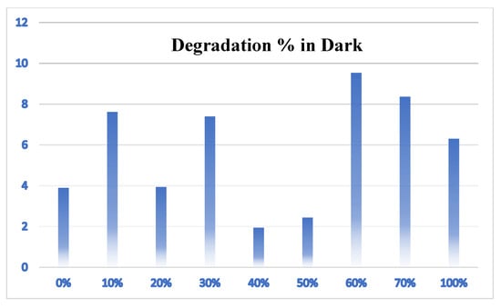 The degradation percentage for CR under dark conditions with continuous stirring ranged for the different ratios between 2 and 10%, proving the photodegradation process noticeably impacted absorption (Figure 6).