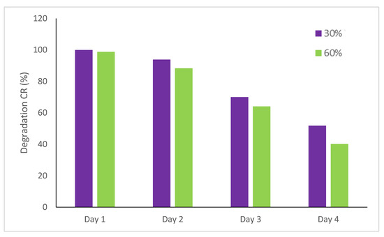 The degradation efficiency of CR after 4 h under the selected parameters is shown in Figure 5. The highest percentages of degradation were found for 30 and 60% TiO2-JK NC and pure TiO2.